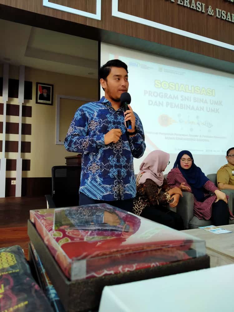 " Program SNI Bina UMK BSN ini merupakan fasilitasi pemerintah untuk kemudahan pengurusan perijinan bagi Pelaku UMKM , Dalam mengurus ijin pelaku usaha hanya membutuhkan kepastian, kemudahan, kecepatan dan transparansi. Dengan OSS semua itu terbantu, Perlu Campur tangan dan dukungan pemerintah bagi UMKM untk menerapkan standar Nasional Indonesia (SNI), SNI juga menciptakan kepercayaan masyarakat luas sebagai konsumen untuk Kesehatan, keselamatan serta keamanan produk dan penggunaanya", bahas Dentino Aji Sasmita dari BSN Pusat.